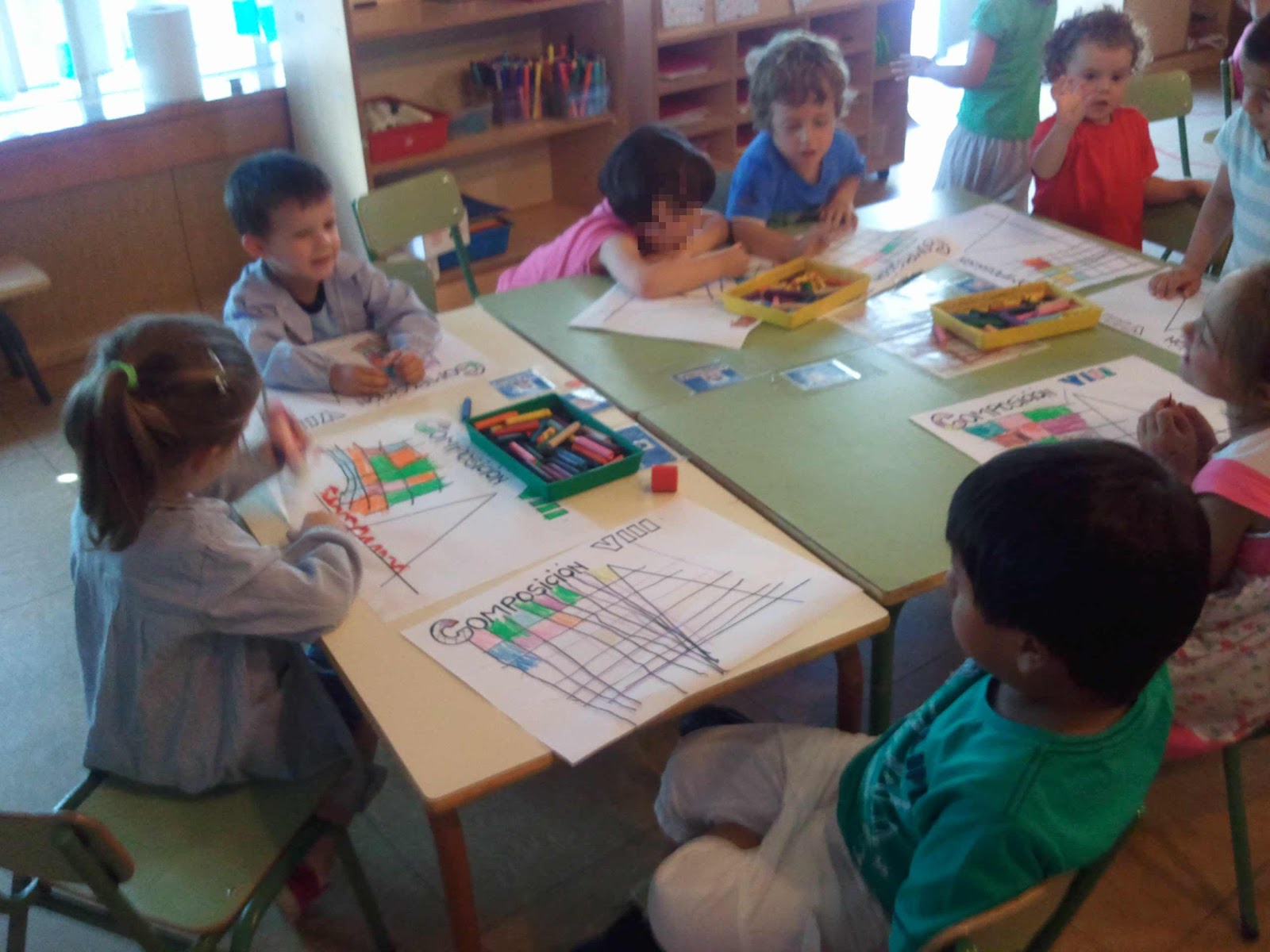 Ha sido un trimestre cortito. Ya llega el verano, las vacaciones, se acaba el curso... Pero aunque ha sido cortito, ha sido muy intenso. Esta vez hemos realizado el cuadro de Kandinsky llamado "Composición VIII". observamos el cuadro en la asamblea y les pedí que me dijeran qué es lo veían. Algunos dijeron que un sol muy oscuro, otros un edificio, Carmen dijo que había muchas C tumbaditas, una A muy grande...Al final decidimos realizar mi compañera y yo un dibujo base para el cuadro en el que habría sólo una A muy grande. Decidimos en la asamblea entre todos realizar la composición VIII pero sólo con algunos elementos: el edificio de cuadros y las C (C de Carmen decían) tumbaditas sobre la letra A.